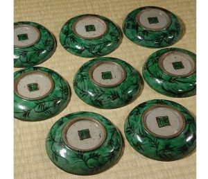 各皿の底部高台内には、角福銘が印字されています!ここも底部の色味と統一して緑で描かれており、デザインに溶け込んでいて良い味を出しています!古い陶器故に、細かいノミホツなど多少は見受けられますが、特に目立った傷もなく、全体的に極めて良好な状態です。そこも含めて味わい深い作品になっているかと思います。