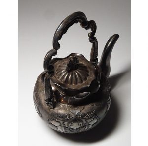 青島〈慶雲〉製・打出彫金桃文銀製湯沸 銀瓶