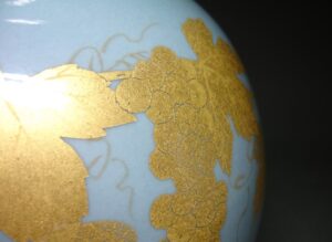 さぁ、吉田美統と言えば、作品に対して大胆に金箔一手で表現されるのが特徴的です。作品名にもあります通り【釉裏金彩】という技法について簡単にご説明させていただきます。