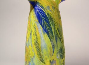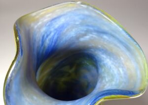 こちらの文化瓶そのものがまるでお花のように、上部が優雅に開いています。この形状により、作品全体がより一層華やかで豪華な立ち振る舞いを見せています。内側に透けた色味が覗かせて、こちらも鮮やかで美しいですね。